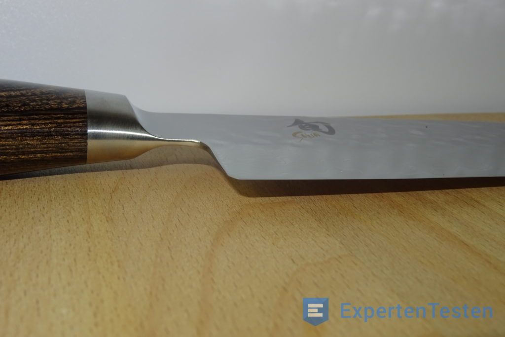 Das schlichte und dennoch edel wirkende Metall, das das Holz umschließt, ist etwas länger als der Griff. Dort finden sich exotische asiatische Schriftzeichen, die zum edlen Aussehen des Messers beitragen. Wir haben, im Rahmen unseres Tests, auch die Länge der eigentlichen Metallklinge vermessen.