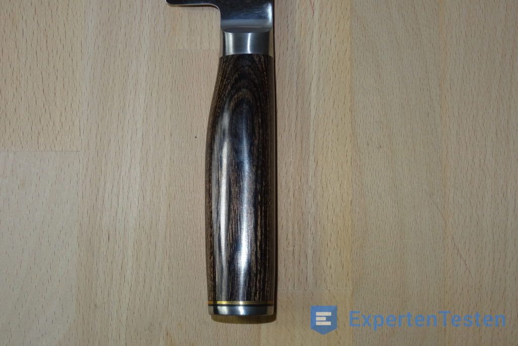 Das harte Holz, aus dem der 12 Zentimeter lange Griff besteht, liegt gut in der Hand. Es wird von einer ausgezeichnet verarbeiteten Einfassung umschlossen, die aus Edelstahl gefertigt wurde.