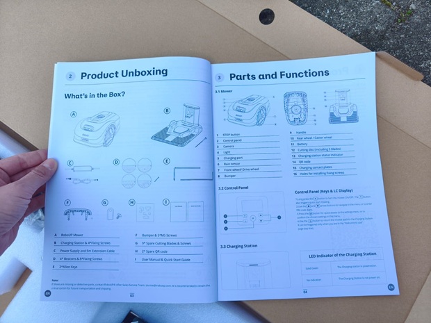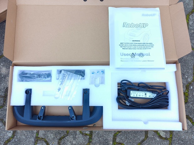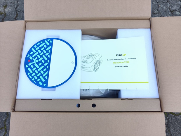 Der Karton wirkt zweckmäßig und darauf ausgelegt, das Gerät sicher zu transportieren. Da der Hersteller den Lieferumfang je nach Vertriebskanal unterschiedlich darstellt, prüfe ich beim Auspacken besonders genau, welche Teile tatsächlich beiliegen. In meinem Paket befinden sich der Mähroboter, die Ladestation, die Stromversorgung sowie die Dokumentation. Zusätzlich liegt Markierungs-/Pin-Zubehör bei, das beim drahtlosen Ansatz eine wichtige Rolle übernehmen kann.