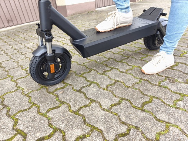 Der dritte Tag gehört dem Komfort: Vorne arbeitet eine einstellbare Öldruck-Federgabel, hinten ein Elastomer-Element, ergänzt durch 10-Zoll-Tubeless-Reifen. Im Zusammenspiel wirkt diese Konfiguration so, als wolle sie vor allem schlechte Beläge deutlich entschärfen. Auf rauem Asphalt und bei typischen Bordsteinkanten schätze ich die erhöhte Bodenfreiheit, da die Gefahr, irgendwo aufzusetzen, subjektiv sinkt.